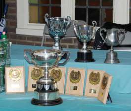 Image on the left: L2R: Lady's; main event and individual trophies. Smaller trophies x6 for team player to keep. Image on the right front row; main team event and team event winners to keep medals.